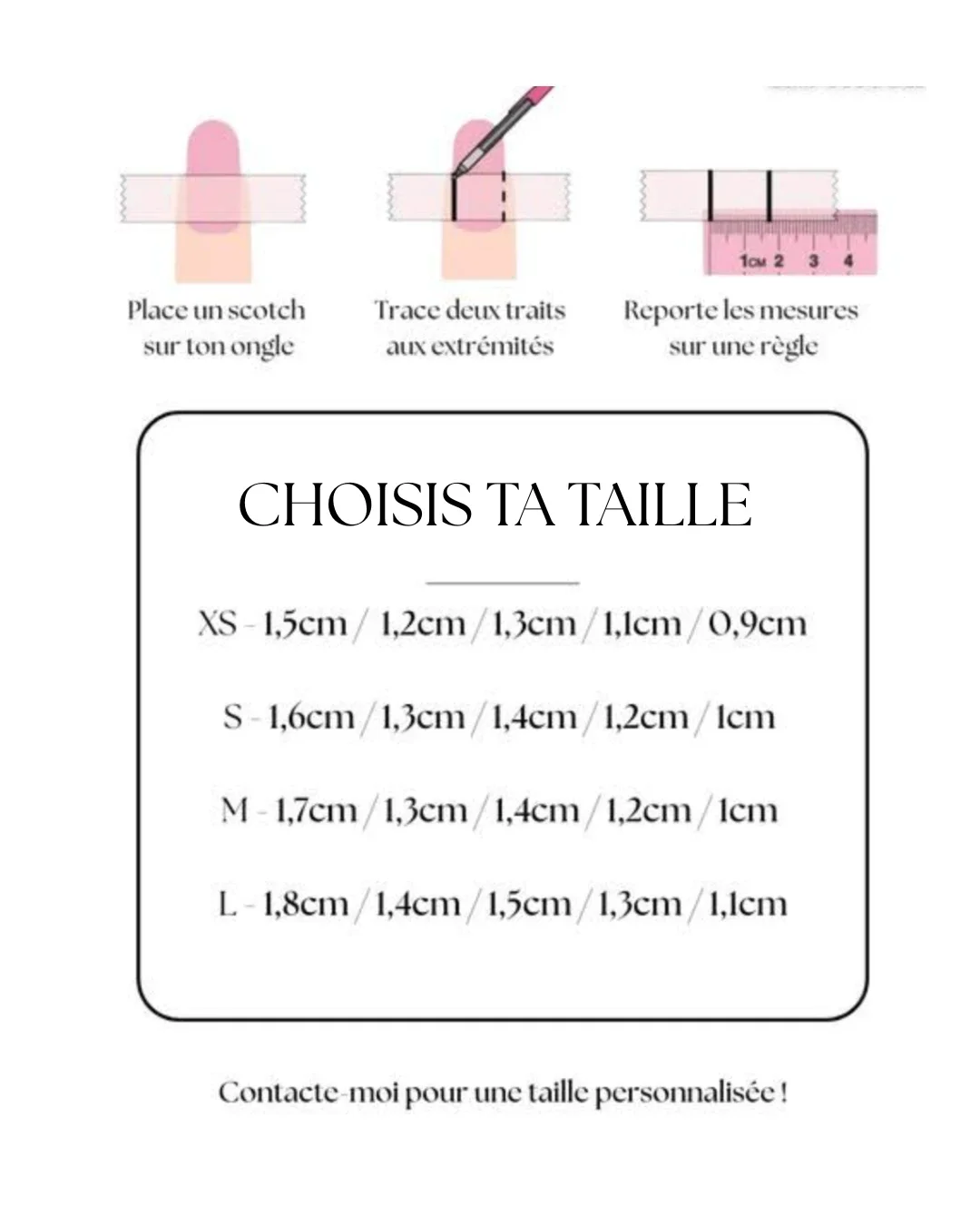 C’est justement pour ça que je te demande de mesurer tes ongles avant la commande (comme indiqué sur la photo dans les photos produits). Chaque set est fait sur mesure, donc parfaitement ajusté à ta morphologie.