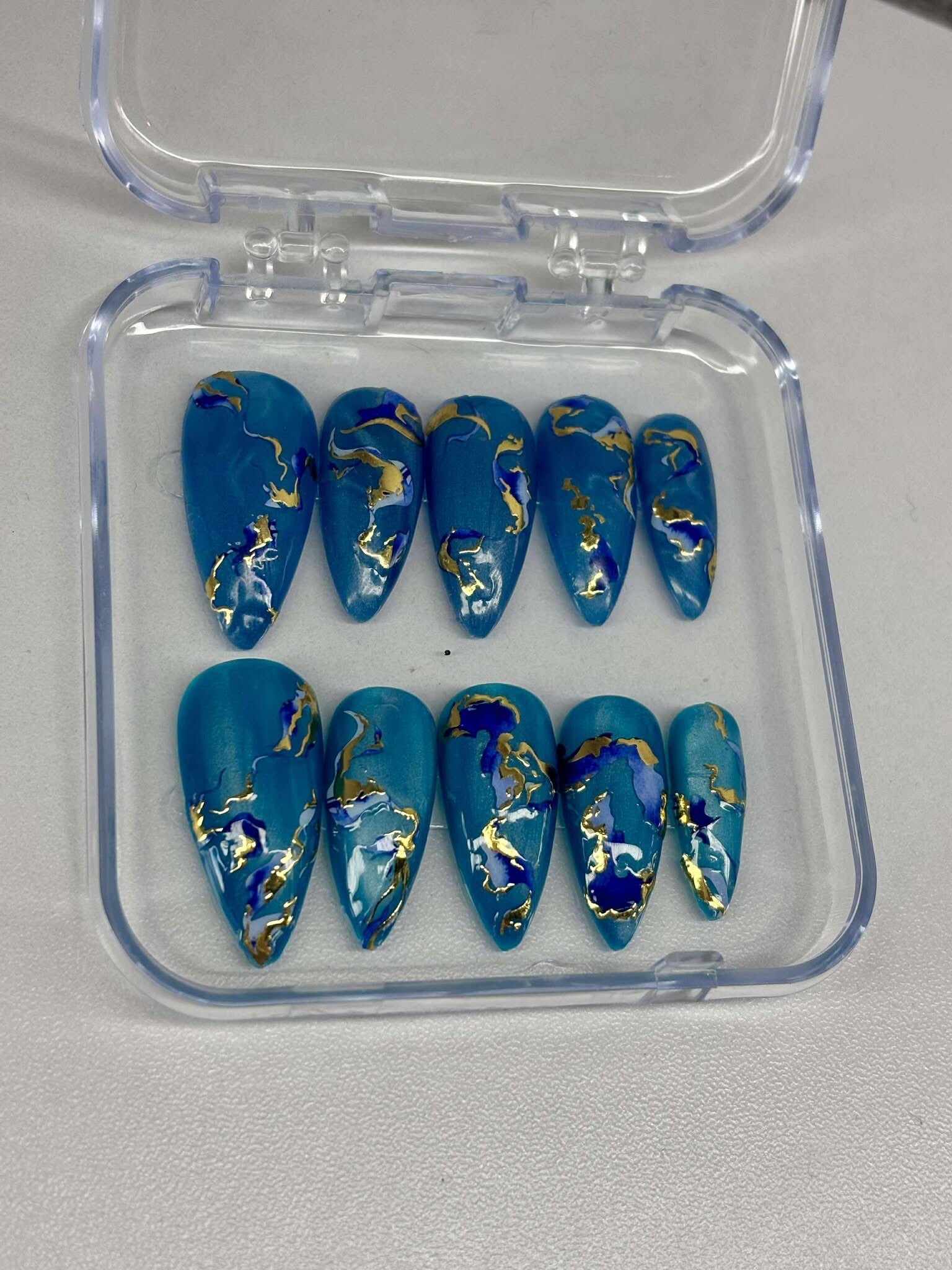 Chaque set est entièrement fait à la main, avec le même soin qu’une manucure en salon. Les photos ne sont que des suggestions : forme, longueur, couleurs, finitions… tout est personnalisable sur le site mais pour une personnalisation encore plus unique ( autre couleurs, strass, finition, détail, ...) contacte moi. Tu choisis, je crée, pour un résultat unique, à ton image.